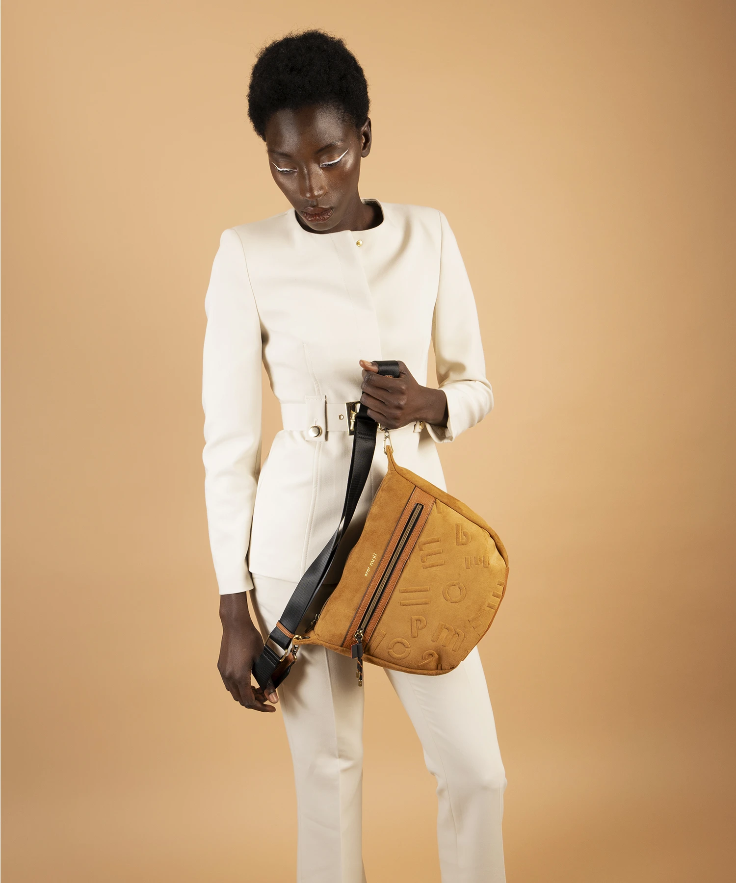 Destaca por su acabado suave con efecto texturizado, que incluye un patrón grabado con el logo en la parte frontal. La correa ajustable permite llevarlo cruzado o al hombro, y los herrajes metálicos aportan un toque de contraste que eleva su estética.