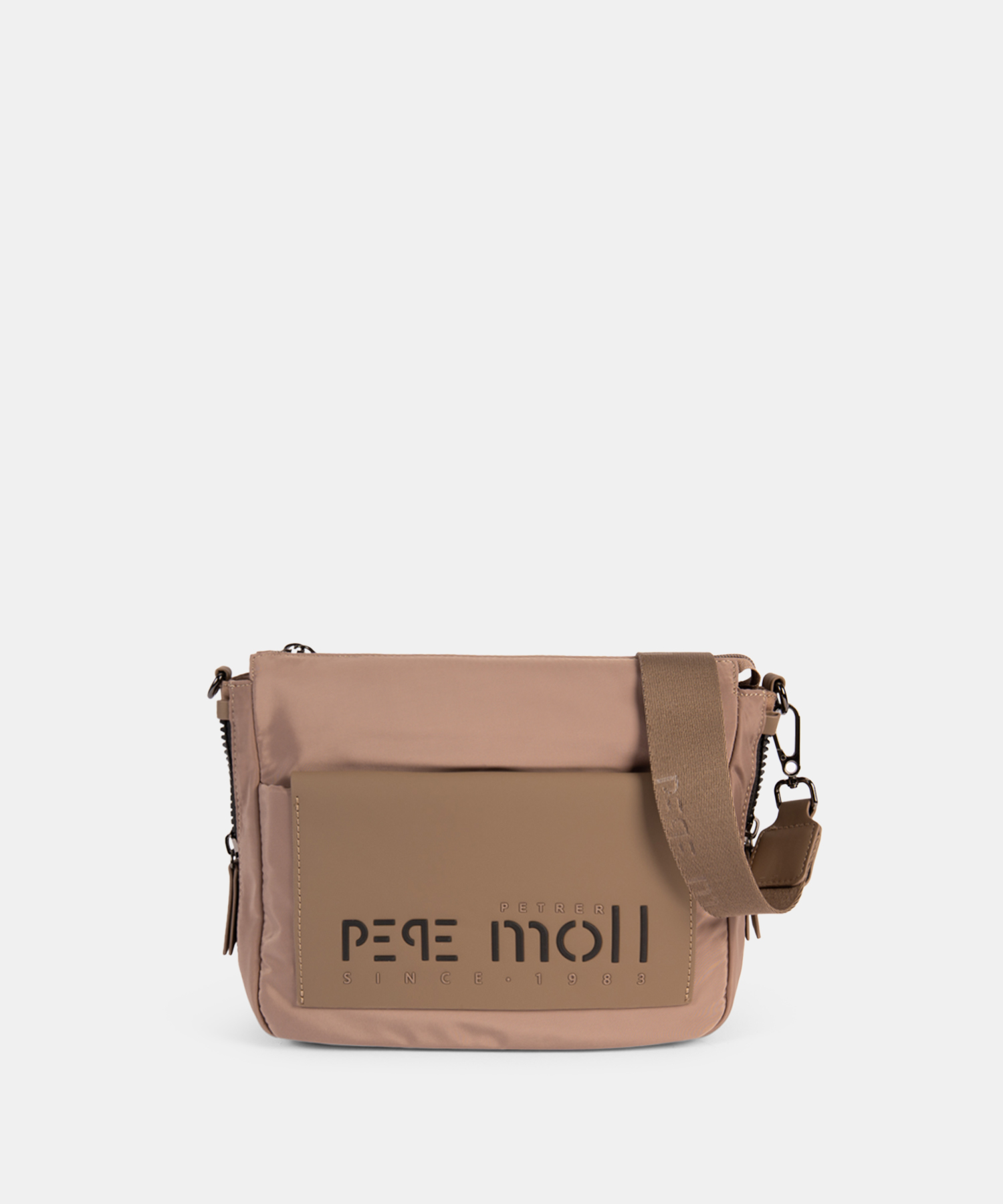 Fabricado con materiales ligeros y resistentes, cuenta con una correa ancha y ajustable que se adapta fácilmente para llevarlo al hombro o cruzado. El parche frontal con el logo grabado en relieve aporta un detalle moderno, mientras que los herrajes en tono oscuro refuerzan su carácter práctico.