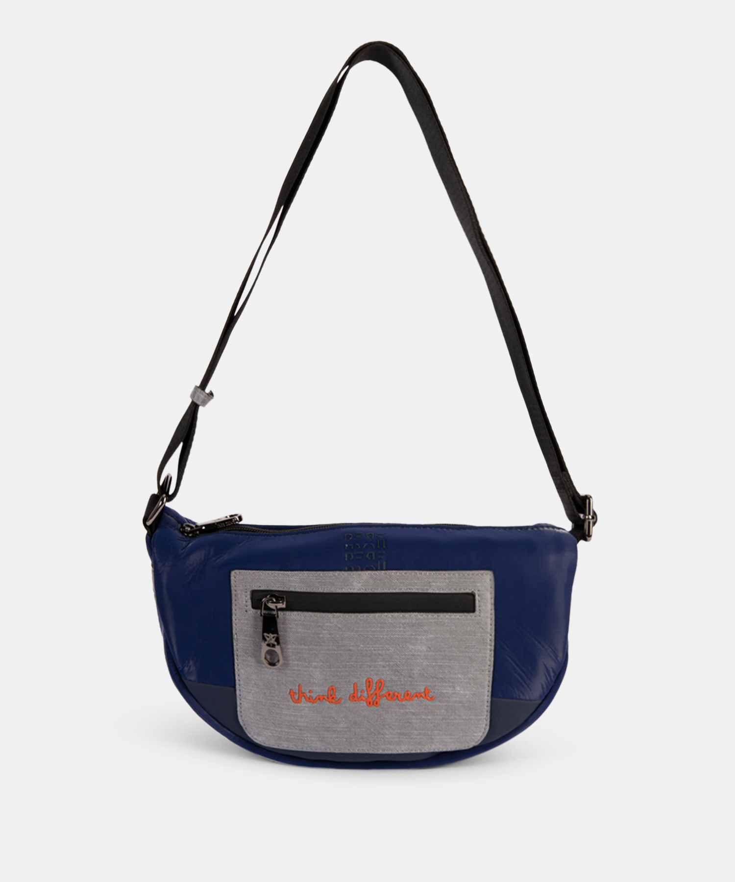 Destaca por su combinación de materiales y texturas, con un cuerpo liso y suave que contrasta con el bolsillo frontal tipo lona, aportando dinamismo visual y un toque contemporáneo. En este bolsillo, la inscripción “think different” le da carácter propio.