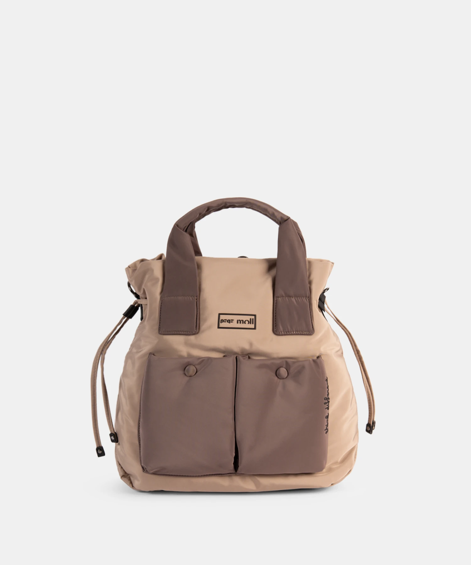 De silueta tipo tote bag, cuenta con cordones laterales ajustables para modificar su forma según lo que necesites llevar. Su exterior incluye dos bolsillos delanteros con botón a presión y un bolsillo trasero con cremallera, ideales para tener a mano lo imprescindible.