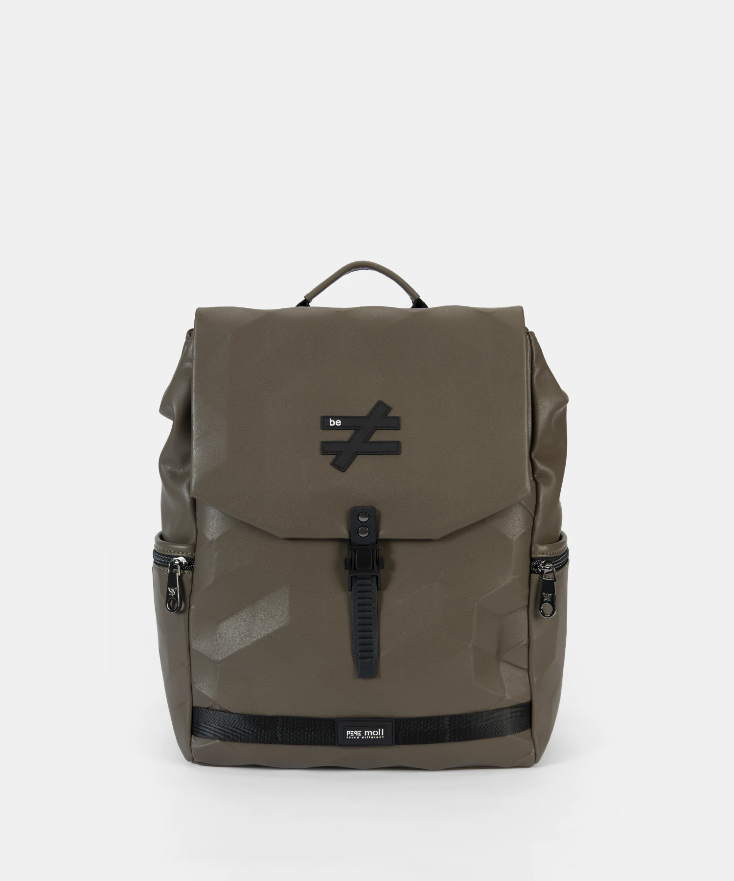 Su estructura presenta un acabado geométrico en relieve, con efecto prismático que aporta dinamismo al diseño sin perder sobriedad. En la parte frontal de la solapa, destaca un mensaje de marca grabado en relieve: «be ≠», una invitación a ser diferente.