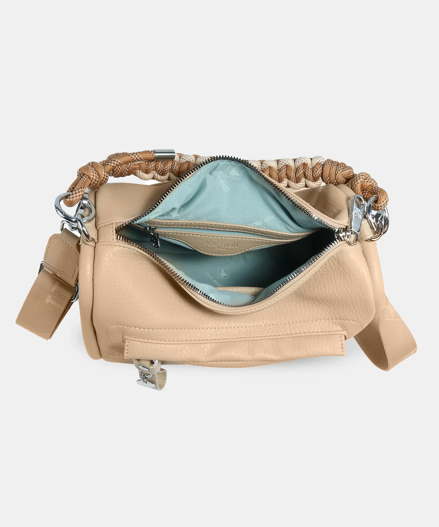 El bolso de mano 261140 de Pepe Moll destaca por su diseño actual y por un detalle que marca la diferencia: su original asa superior trenzada, que aporta personalidad y un toque moderno al conjunto. Su silueta estructurada lo convierte en un bolso cómodo y estiloso para acompañarte en cualquier momento del día.