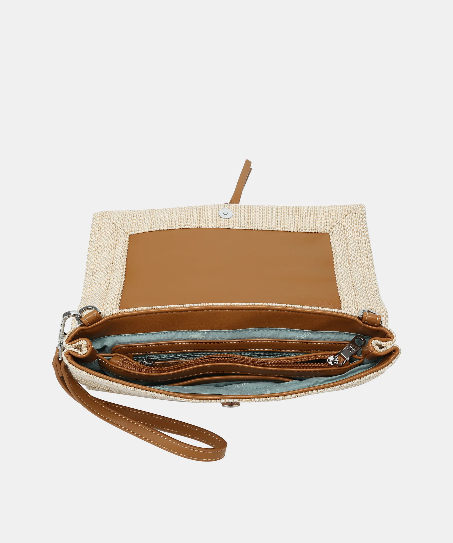 El bolso de mano 261435 de Pepe Moll es un diseño elegante y versátil que combina una estética natural con detalles sofisticados. Su estructura tipo clutch y su textura inspirada en fibras naturales aportan un aire fresco y atemporal, ideal para completar looks de primavera y verano con un toque refinado y muy actual.
