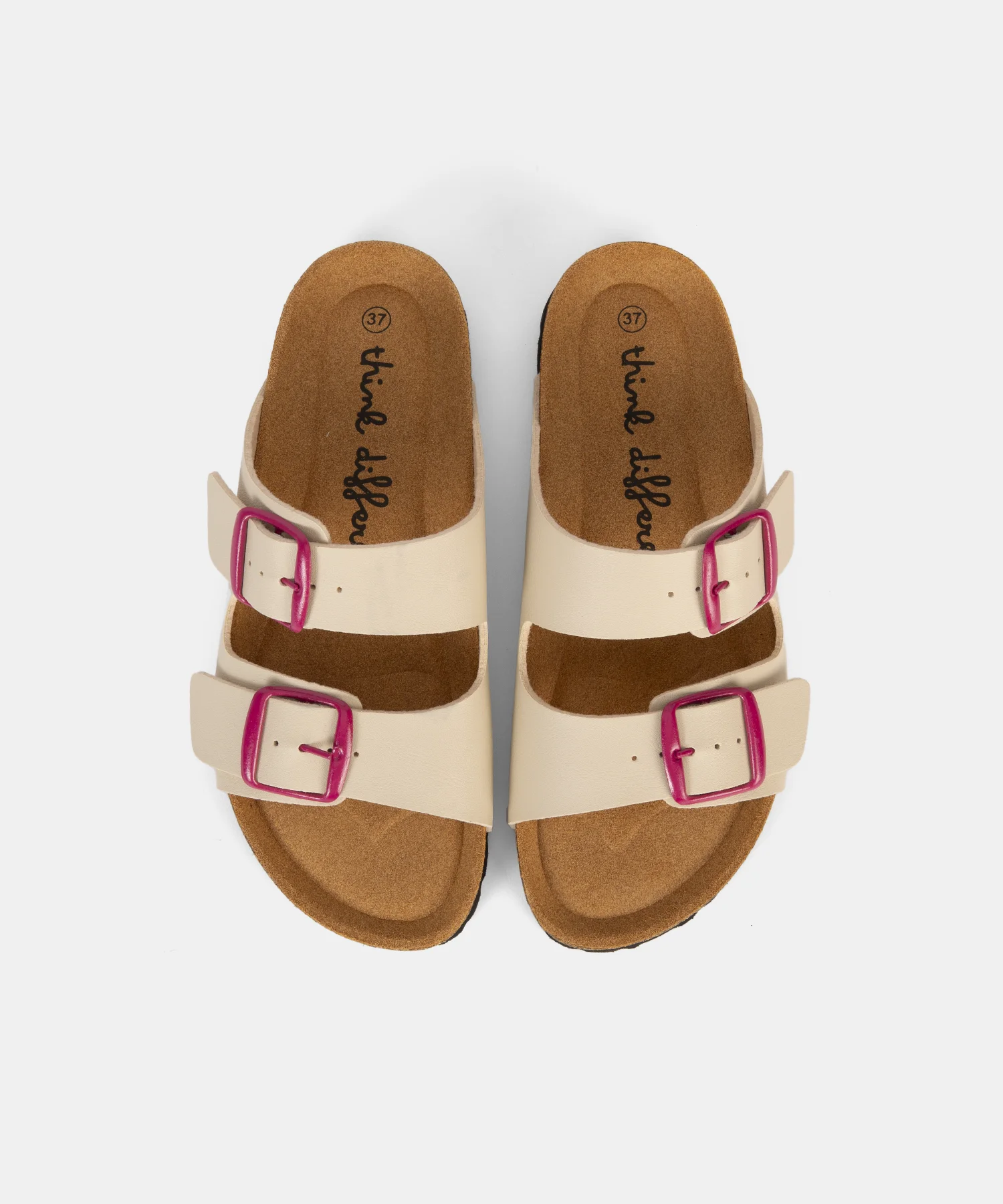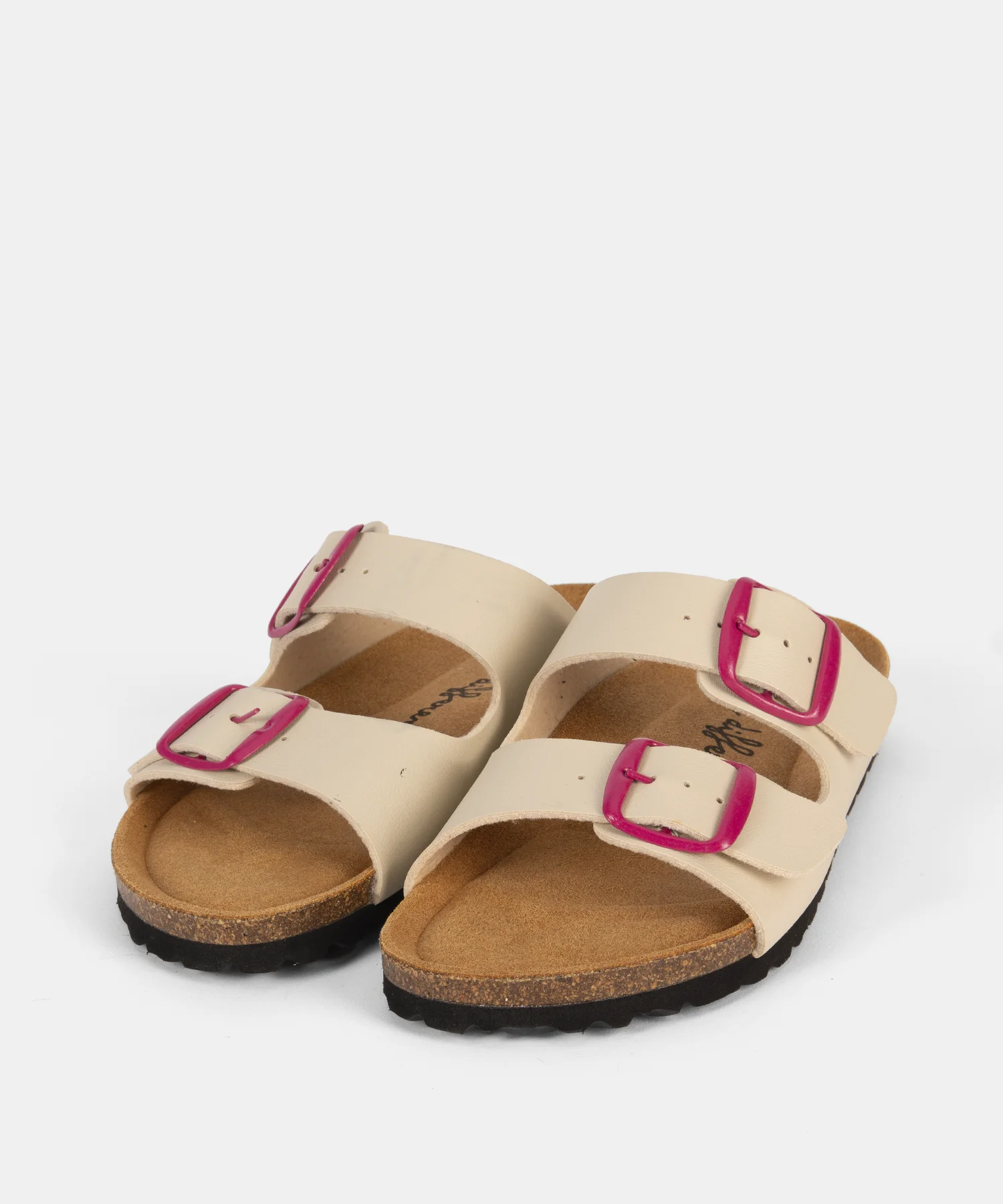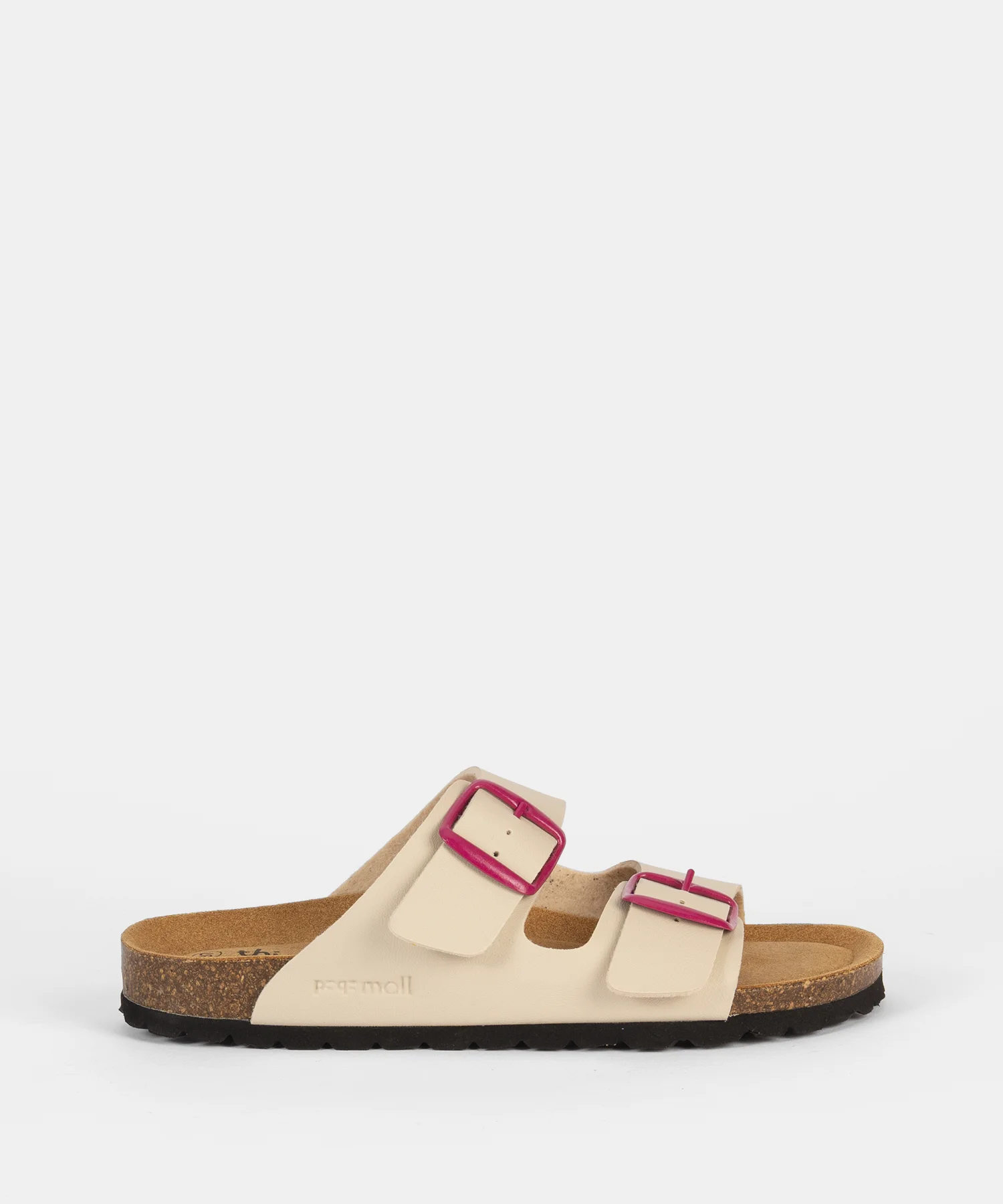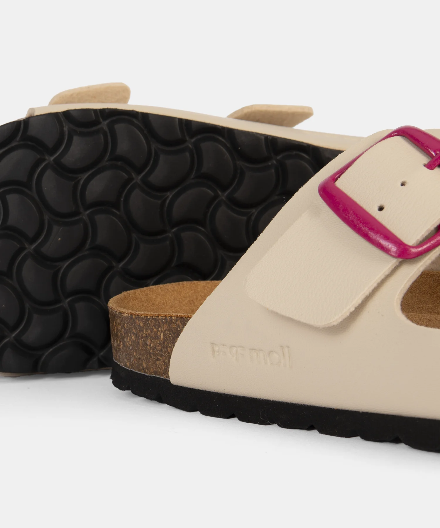Las sandalias de mujer blancas 261970 de Pepe Moll combinan un diseño tipo bio muy limpio con un detalle de color que cambia por completo el resultado. La base en blanco roto les da una imagen luminosa, fresca y muy fácil de combinar, mientras que las hebillas en fucsia aportan ese contraste llamativo que llena el look de personalidad. Es un modelo que mantiene una estética relajada y funcional, pero con un punto alegre y actual que lo hace mucho más especial que una sandalia básica de verano.