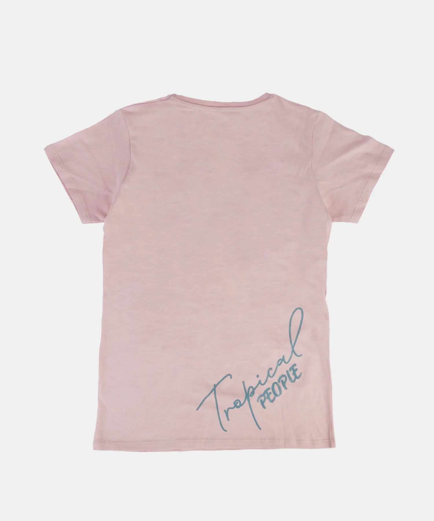 Además, su silueta de manga corta y cuello redondo hace que resulte muy fácil de combinar en el día a día. El detalle gráfico de la espalda con el texto “Tropical People” refuerza ese espíritu alegre y casual del modelo, haciendo que la camiseta tenga encanto tanto por delante como por detrás. Queda genial con vaqueros, shorts, faldas o prendas básicas a las que quieras sumar un toque de color suave y un diseño original con mucha actitud veraniega.