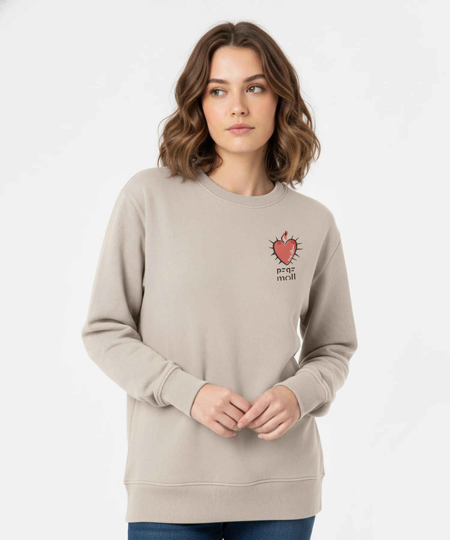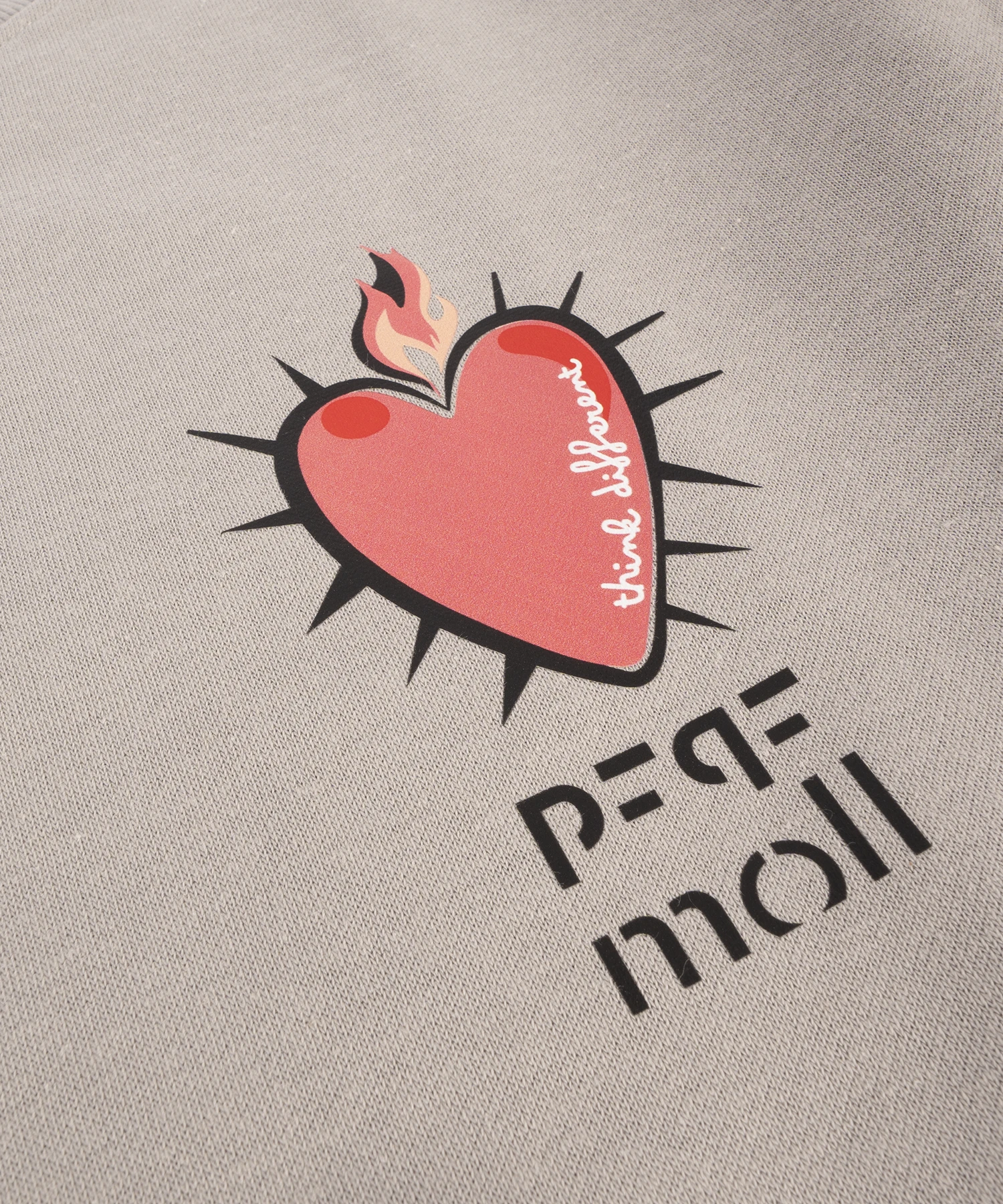 En la parte frontal, el diseño se sitúa en el lado izquierdo del pecho: un Corazón al estilo tattoo, con espinas, una llama en la parte superior y la frase “think different” en su interior. Debajo, el logo de la marca «PEPE MOLL» aporta el cierre perfecto.
