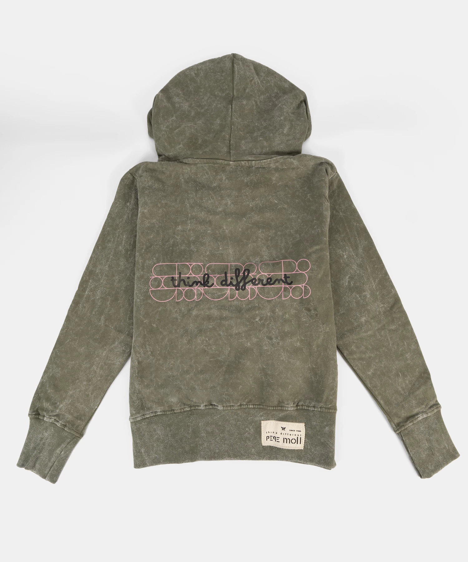 La sudadera verde 252897 con capucha de Pepe Moll es mucho más que una hoodie clásica. Su acabado desgastado y su diseño gráfico en la espalda la convierten en una prenda con alma urbana y estilo único.